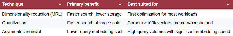 Applications that prioritize low latency will benefit most from dimensionality reduction and quantization. Systems that process very large volumes of queries should prioritize asymmetric retrieval to reduce embedding generation costs.